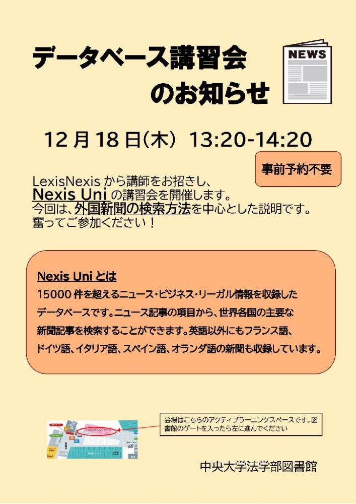 LexisNexisから講師をお招きし、Nexis Uniの講習会を開催します。 今回は、外国新聞の検索方法を中心とした説明です。 奮ってご参加ください!