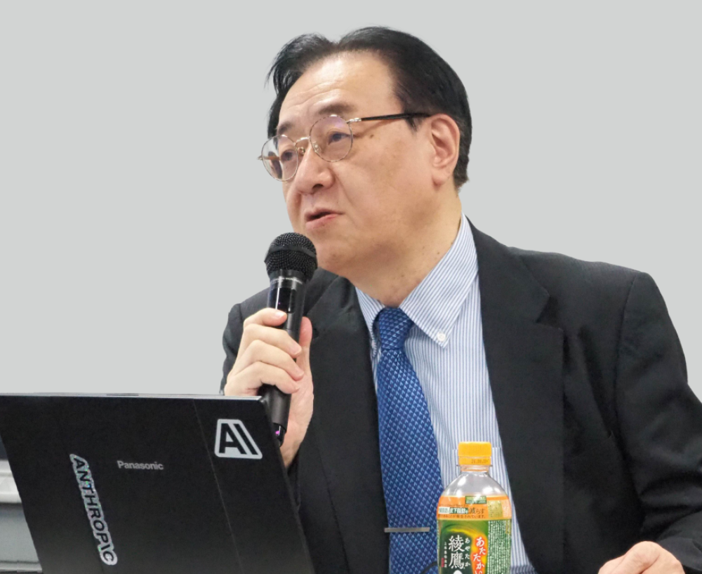 設立総会では、同研究会長となったELSIセンター前所長の国際情報学部 須藤 修教授が、設立記念 基調講演を行いました。須藤教授は、行政・公共サービスにおけるAI実装を阻む最大の要因はデータの信頼性であること、ナレッジベースの仕様とナレッジを共有財産とする「オープンなデータエコシステム」を通じて、社会全体の知能化を牽引できると考えています。