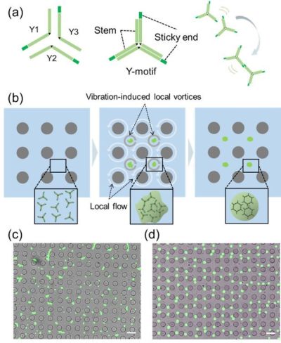 (a) 4nt Yモチーフ構造の模式図および粘着相互作用の原理。(b) VILV場内における均一凝縮体の形成過程の模式図。(c, d) マイクロピラー配列とDNA凝集体(緑)をそれぞれ示す、明視野観察と蛍光観察の合成画像。スケールバー = 100 µm。(c) 振動なし4時間後の画像。(d) VIFを10分間印加後3.5時間後の画像。