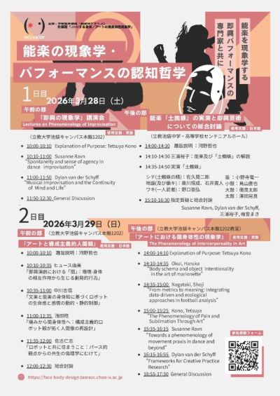 本シンポジウムでは、南デンマーク大学のスサンヌ・ウラン教授、メルボルン音楽院のディラン・ファン=デル=スケフ准教授をはじめ、国内外の専門家が即興性、身体性、間身体性に関する最新研究を発表します。加えて、能楽「土蜘蛛」の実演を通し、伝統芸能における身体知と創発的行為の理解を深化させるセッションが行われます。