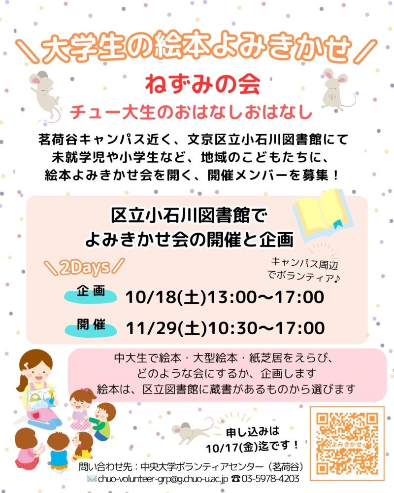 ◎活動内容:中央大学生が絵本よみきかせ会「ねずみの会〜チュー王子のおはなし、おはなし」を企画・開催