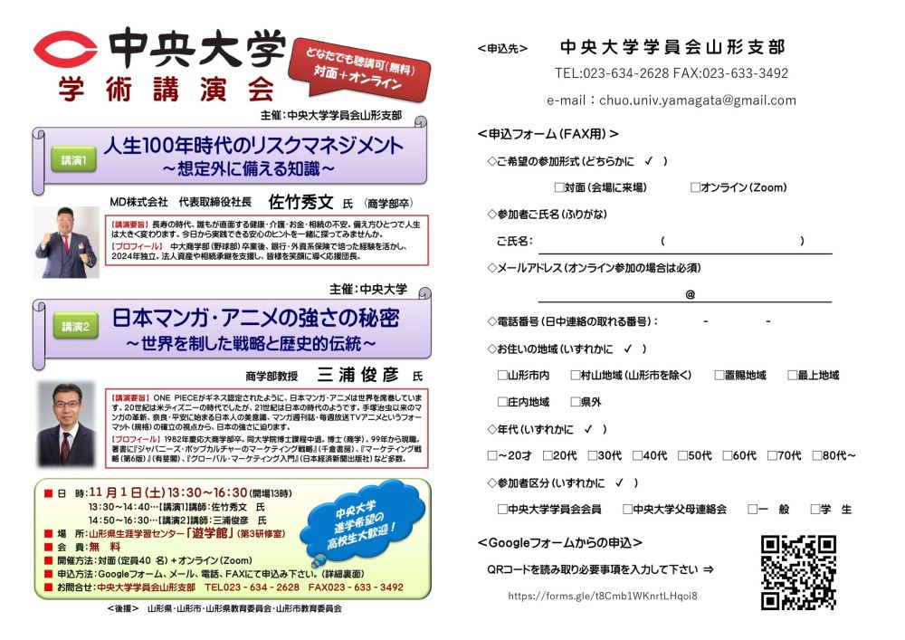 恒例の中央大学学術講演会が学員会山形支部との共催で開催されます。勉学の秋、これを機会に、御子女様日頃受けている授業を実際に体験してみてはいかがでしょうか。